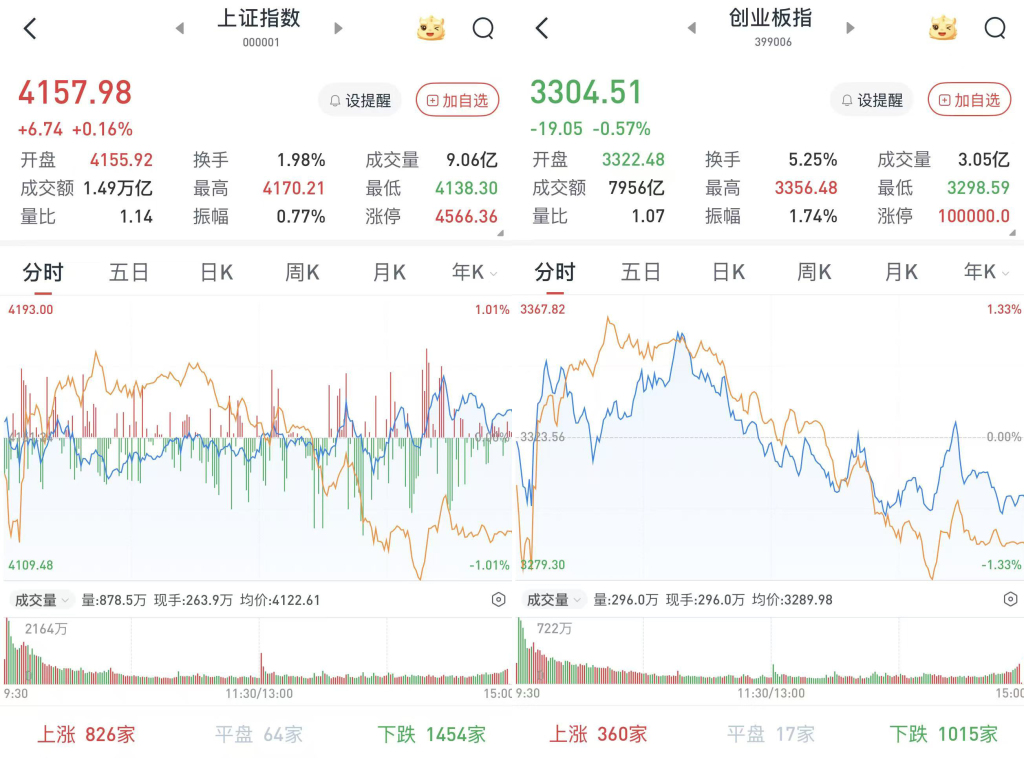 至收盘,上证综指涨0.16%,报4157.98点;科创50指数跌3.03%,报1507.64点;深证成指跌0.3%,报14300.08点;创业板指跌0.57%,报3304.51点。